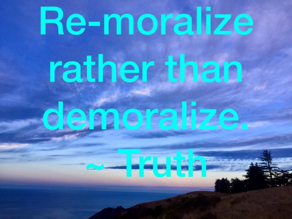 Which is another way of saying not to “take morals away” but to “reinforce morals” or “renew morality.” And isn’t re-moralizing a positive and aspirational act? When we re-moralize we reinstate a moral direction, re-assert moral values, reinforce the morals of encouragement, positivity and laughter.